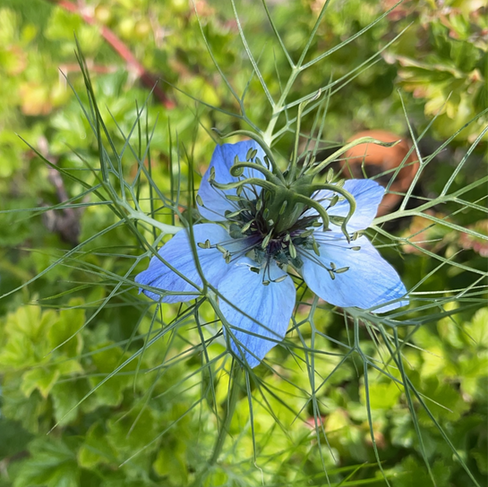 Blomster er der masser af. De samme som sidst, men nu også busk- og klatreroserne, iris, selvsåede valmuer, jomfru i det grønne, pomerans-høgeurt og meget andet, jeg ikke lige kan huske. Jeg er begyndt at rydde det ringformede bed omkring mamelukærmerne - de vokser iøvrigt fint - for visne toppe af tulipaner og påskeliljer, afblomstrede spejlæg, morgenfruer og forskelligt ukrudt. Meningen er, at der skal sås græs dér. Det halvvilde indtryk var egentlig slet ikke så tosset, men ukrudtet begyndte at dominere, og sneglene gemte sig mellem de mange og efterhånden høje planter. De valmuer og jomfru-i-det-grønne, der står der, lader jeg være en uges tid eller så endnu, til de er afblomstret, for de er ret kønne.